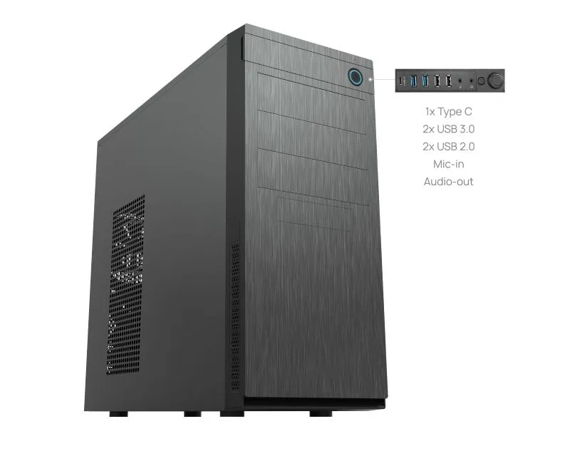 Osnovne karakteristike - Format kućišta: Midi Tower Podržani formati matičnih ploča: ATX,microATX,Mini-ITX Napajanje - Snaga napajanja: Bez napajanja Ležišta za spoljne uređaje - 5.25": 3 3.5": 1 Unutrašnja ležišta - Unutrašnja 3.5" ležišta: 5 Unutrašnja 2.5" ležišta: 3 Priključci napred - USB 3.1: 1 Tip C USB 3.0: 2 USB 2.0: 2 Audio: 2x 3.5mm (izlaz + ulaz) Ležišta za ventilatore - Prednja strana: 1x120mm ili 1x90mm ili 1x80mm Poleđina: 1x120mm ili 1x90mm ili 1x80mm Kompatibilnost - Maksimalni broj slotova: 7 Maksimalna visina procesorskog hladnjaka: 155mm Maksimalna dužina grafičke karte: 250mm (sa kavezom za hard diskove) Fizičke karakteristike - Dimenzije: 450mm x 412mm x 185mm Materijal: Čelik (0.6mm) Masa: 4kg Boja: Crna Stanje: Nekorišćeno Pakovanje: Set šrafova Reklamacioni period - Reklamacioni period: 24 meseca