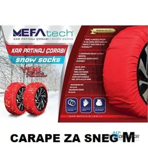 Mefa tech auto čarape za sneg i led. Zamena za auto lance. Dozvoljeno po zakonu. Jednostavno postavljanje za 2 minuta. čarape se postavljaju na pogonske točkove. Postaviti čarapu na vrh točka i navlačiti je na dole sve dok je to moguće. Malo pomeriti auto napred ili nazad da bi navukli čarapu na ceo točak. Ukoliko put nije prekriven snegom preporučujemo da ne koristite čarape za sneg i led. Nakon korišćenja preporučujemo da ručno obrišete i osušite čarape pre nego sto ih vratite u pakovanje. brzina kretanja vozila sa čarapama ne sme biti veca od 50 km-H. Nagla kočenja i ubrzanja mogu oštetiti čarape. Kada je vozilo parkirano, čarape se moraju ukloniti sa točkova zbog rizika od smrzavanja pri niskim temperaturama.