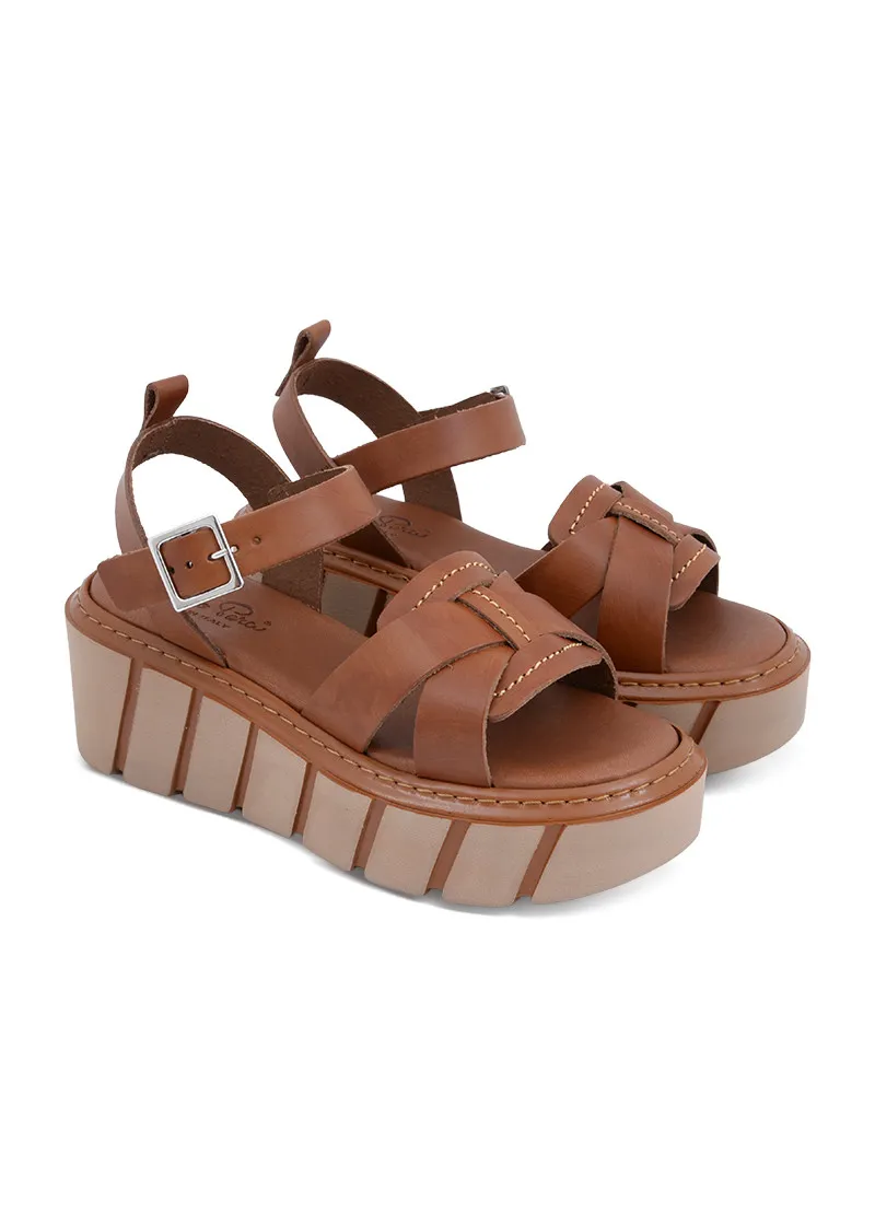 Sastav: Gornjište: Koža Gazište: Tekstil Opis: Kožne ženske sandale sa ukrštenim kaiševima u kamel i bež boji i platforma đonom